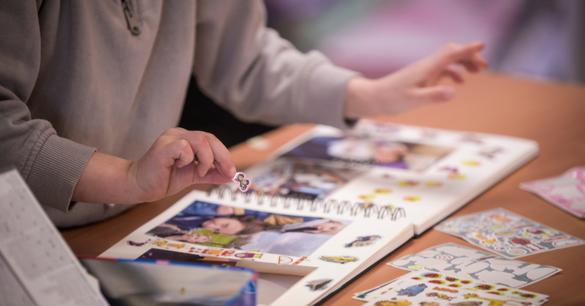 Tijdens elke vakantieperiode schuiven heel wat kinderen aan om nieuwe foto’s in hun album te plakken. Het idee ontstond enkele jaren geleden, toen begeleidster Emeline het team vervoegde. “Ik merkte dat de meeste kinderen geen fotoalbum hadden. Wanneer ze vertrokken, maakten de begeleiders vaak nog snel een album zodat ze toch iets hadden om mee te nemen.” Daarom startte ze ateliers waarin kinderen zelf hun eigen fotoalbum maken. Foto na foto verzamelen ze herinneringen aan momenten die voor hen belangrijk zijn.